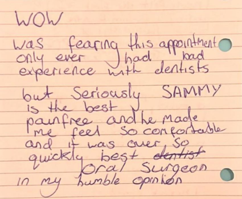 Wow. Was fearing this appointment as only ever had bad experiences with dentists but seriously Samy is the best. Pain free, he made me feel so comfortable and it was over so quickly. Best oral surgeon in my humble opinion.